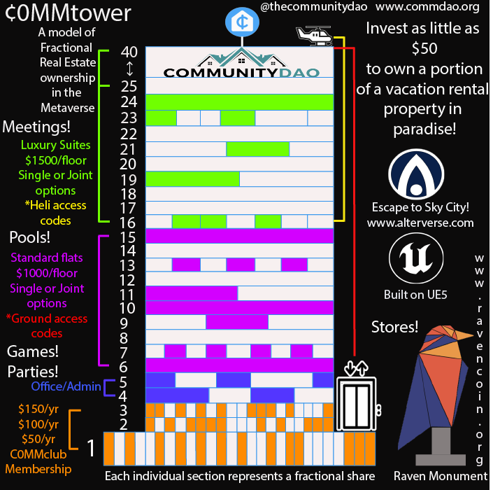 To promote Ravencoin, we at CommDAO, will also be sponsoring the construction of a 3d modeled Raven monument, the first in history, inside of Sky City, near the CommTower! More details will be coming soon about the “Quest For Lenore” and how you can become a part of the action. Stay tuned…
