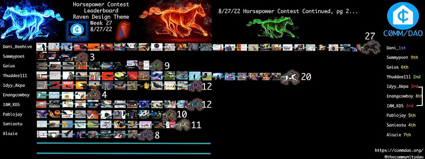 A major function of CommDAO going forward is structuring and refining a series of weekly themed graphic design contests for active content creators. We think we have established a winning model! The top 15 picks from the Triumvirate Governance Body’s 3 sectors: Foundation, Marketing, and Research make up the primary judging activity. From there, we have some other goal points that create a more competitive spirit and help build momentum. Each pick receives 50 RVN/500 C0MM. Each sector picks 5 favorites. Top performer (most likes) wins 100 RVN/1000 C0MM. Top 3 performers have their design minted as an NFT on the Ravencoin blockchain, struck from our C0MM main asset token, and returned to the creators as trophies, collectibles, and tradable RVN based NFTs. In addition to these, we are also introducing a “Horsepower” Component based on the sheer # of output on a particular theme. The person who makes the most designs here wins 100 RVN/1000 C0MM, 2nd place 75 RVN/750 C0MM, and 3rd place 50 RVN/500 C0MM.